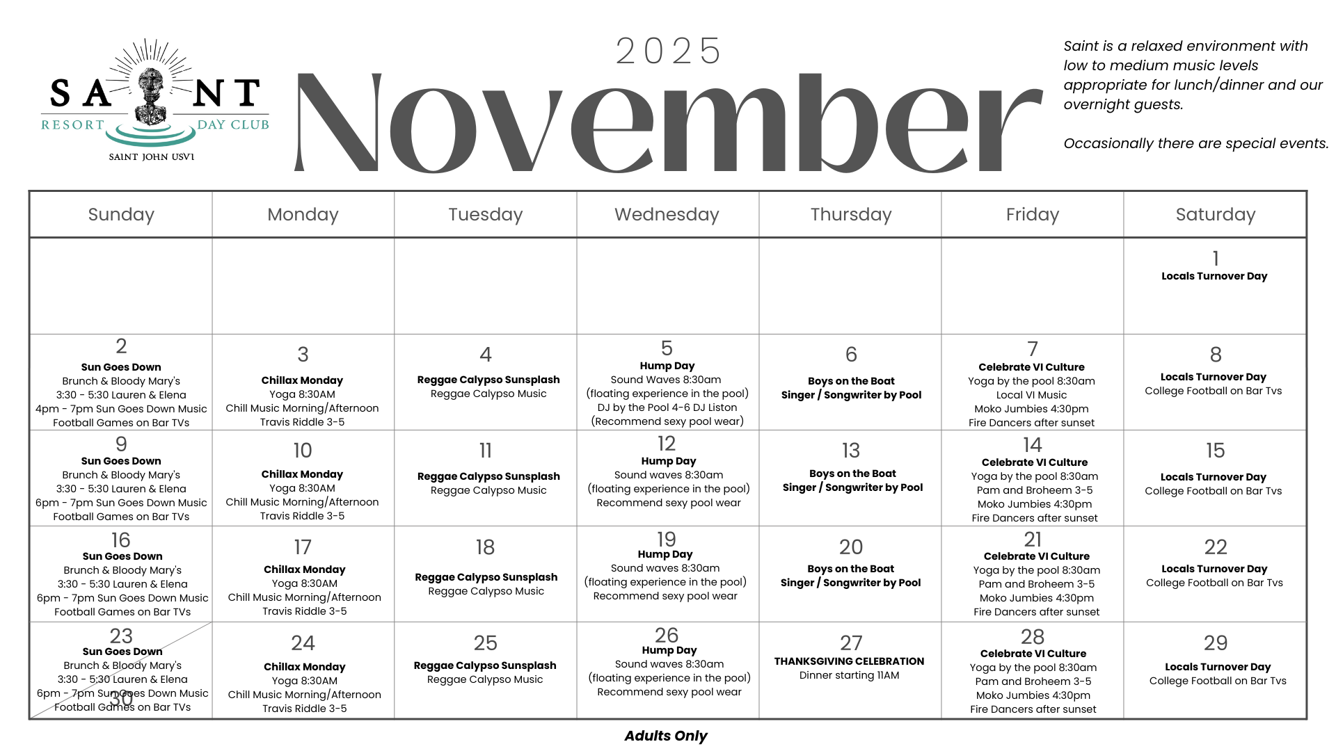 At The Saint, entertainment is part of the rhythm of the place. Mornings begin with yoga, sound healing, and wellness classes designed to ease you into the day. By afternoon, the pool comes alive with live music every Wednesday, Thursday, and Sunday, creating the perfect backdrop for relaxing with a cocktail in hand. Fire Fridays brings our signature fire dancer show to the The Saint immediately following sunset. Scroll down to see what's coming up!